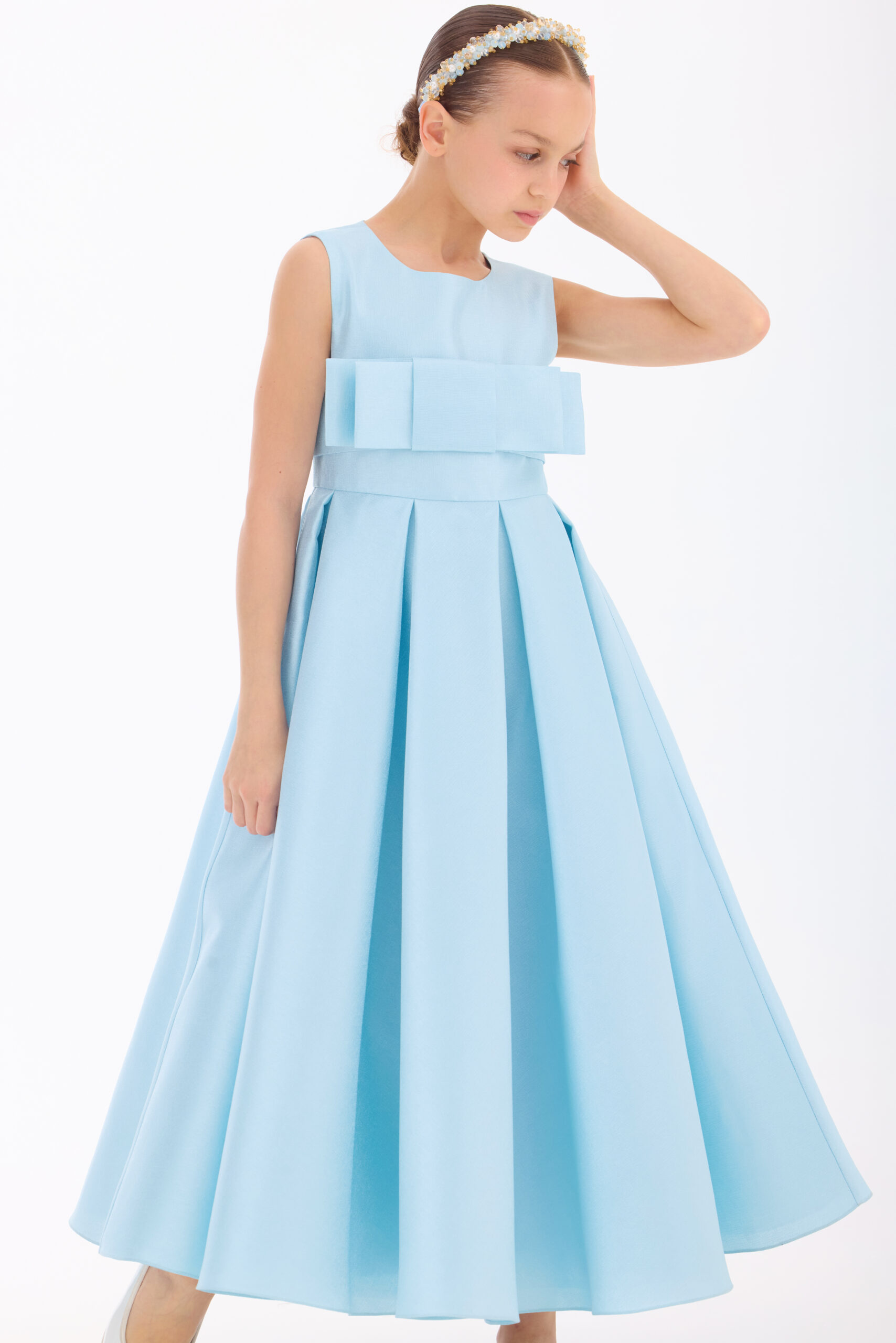 The voluminous pleated skirt flows effortlessly, creating a majestic movement ideal for grand occasions. Carefully layered materials provide both structure and comfort, while the breathable cotton underlayer ensures the child feels comfortable throughout the day. This gown is an exquisite choice for weddings, formal celebrations, and unforgettable gala moments.