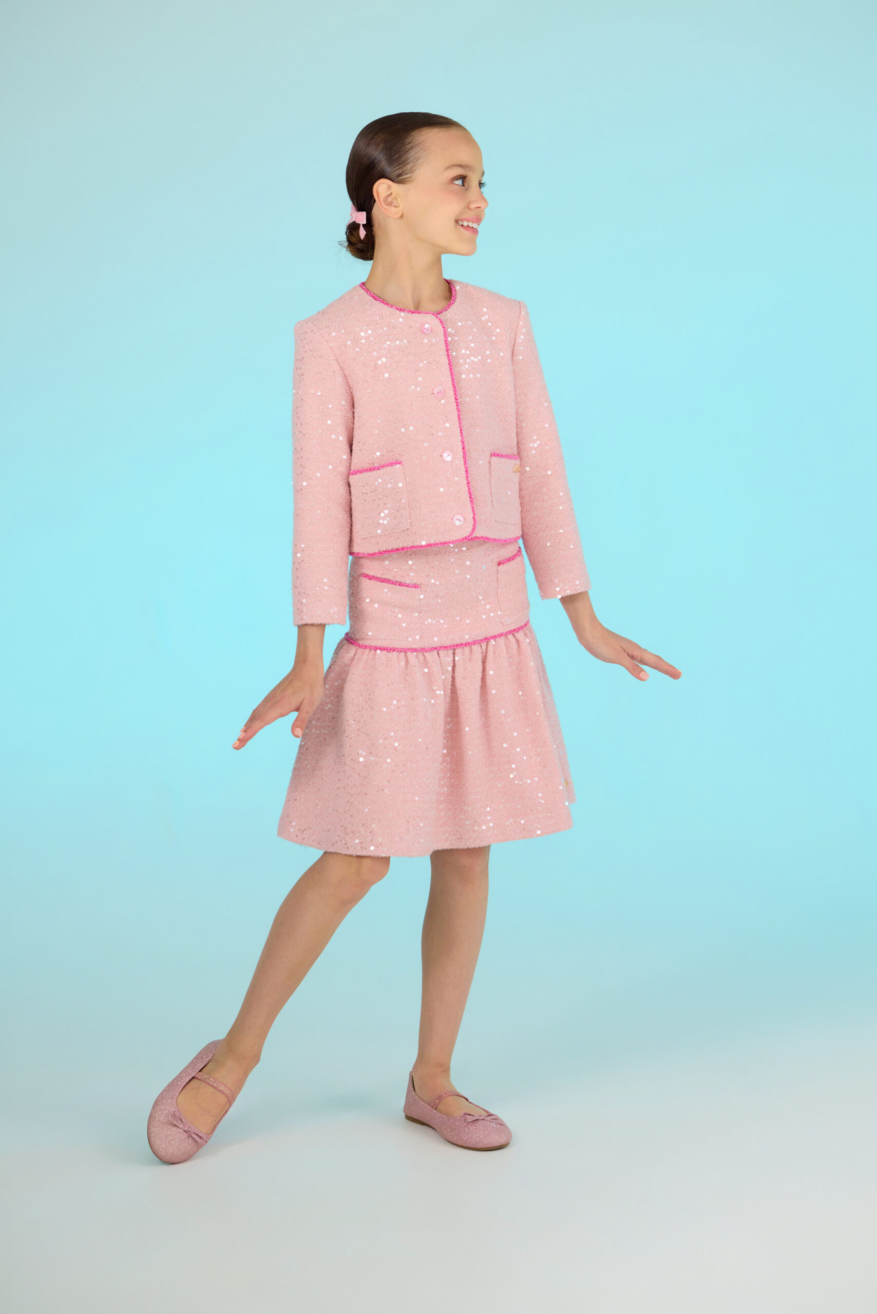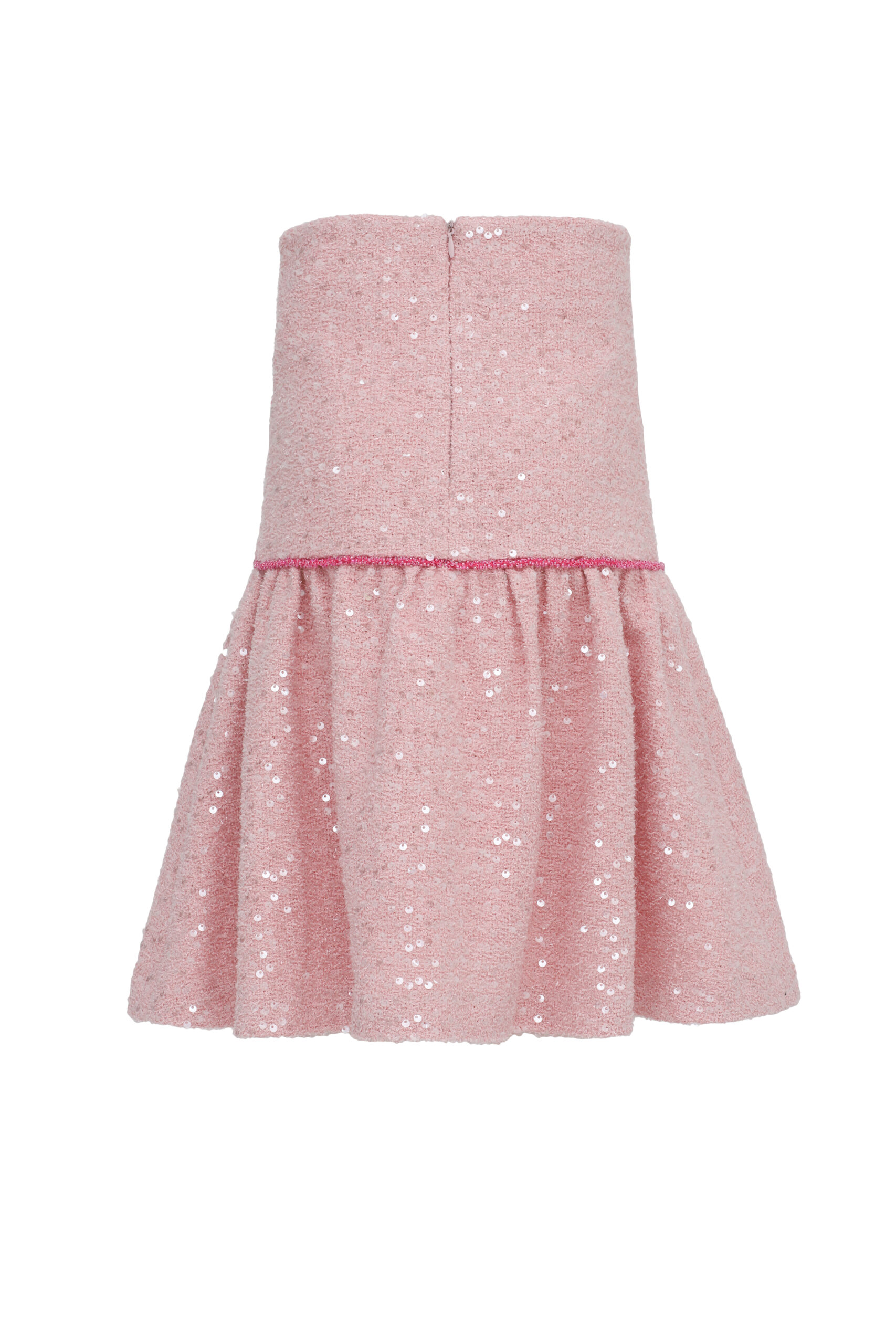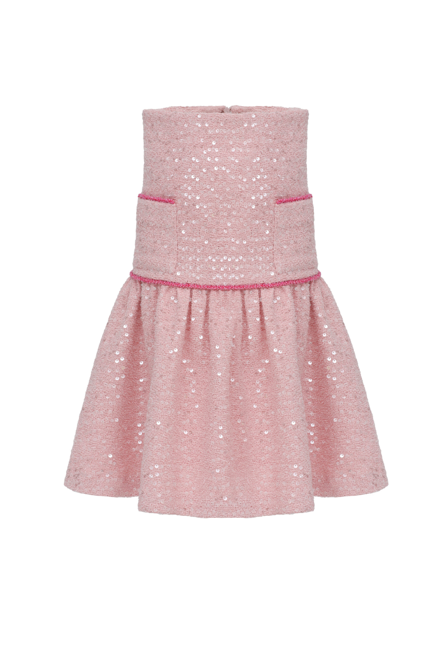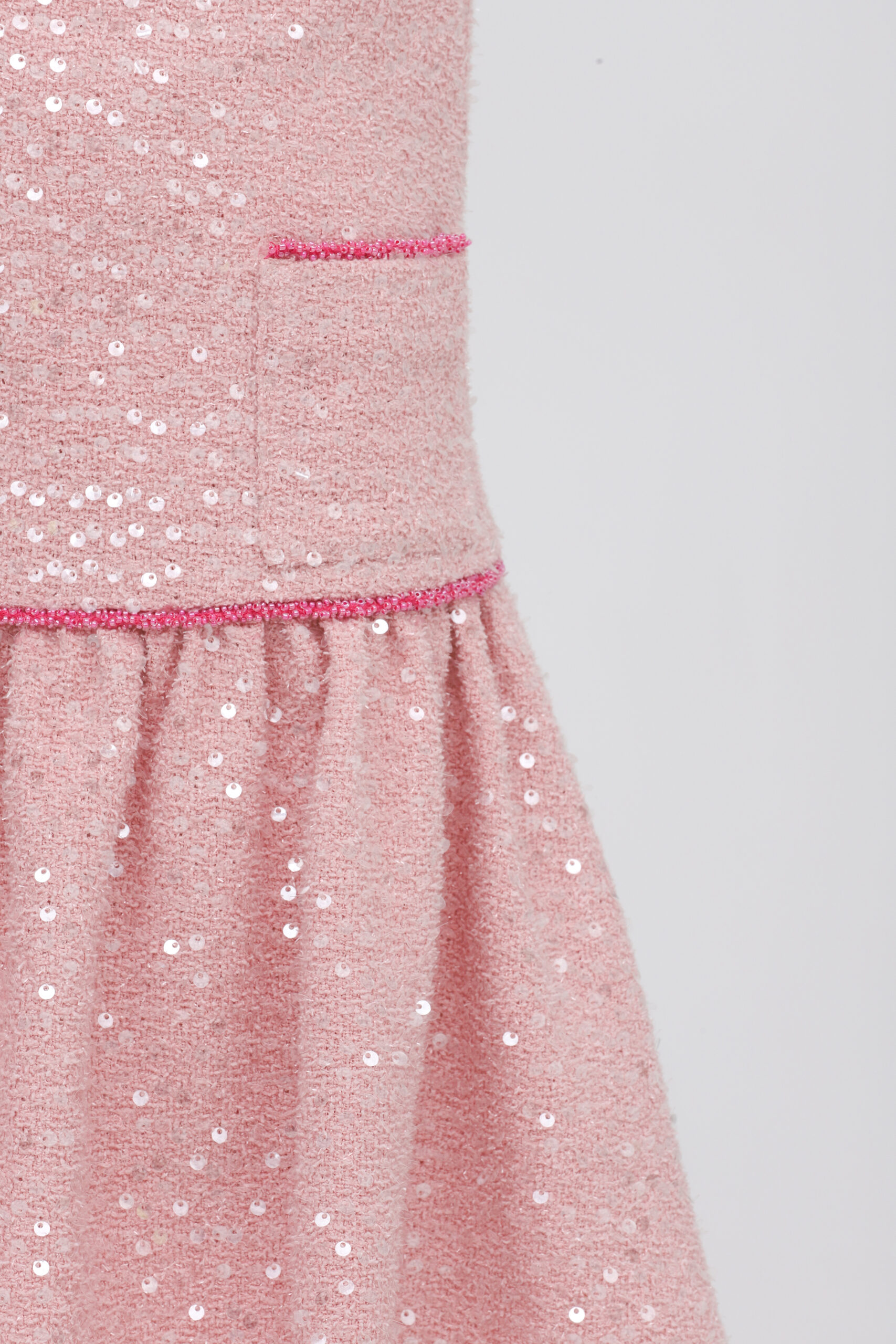 A whisper of Parisian elegance, the Cherie Rose Sequin Skirt in soft pink tweed is designed to capture timeless sophistication with a touch of modern sparkle. Shimmering sequins are delicately woven into the tweed base, creating a refined radiance that catches the light with every movement. The straight silhouette lends classic charm, while the two decorative pockets, trimmed with delicate pink pearls, bring a couture-inspired finish reminiscent of Chanel’s iconic style.