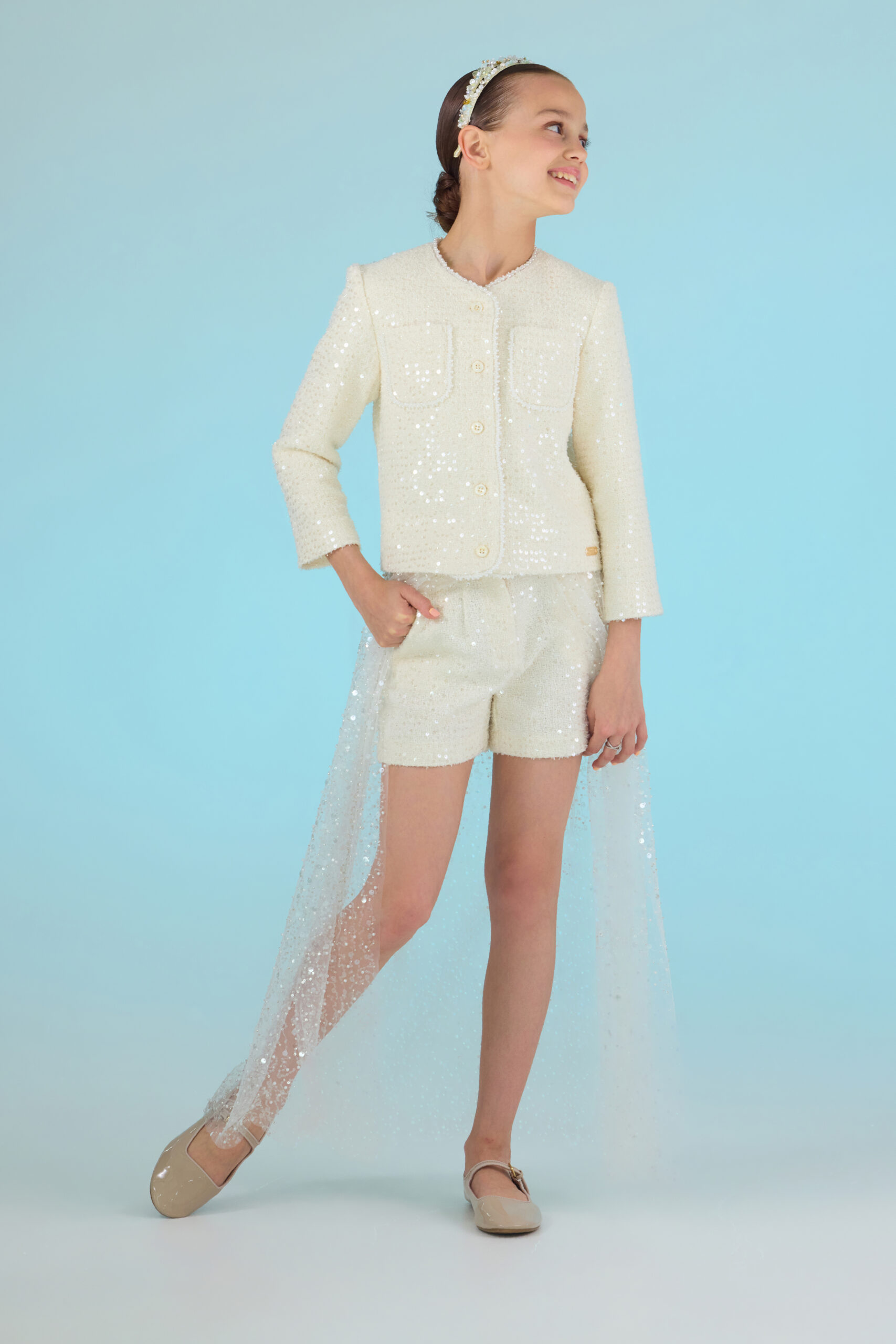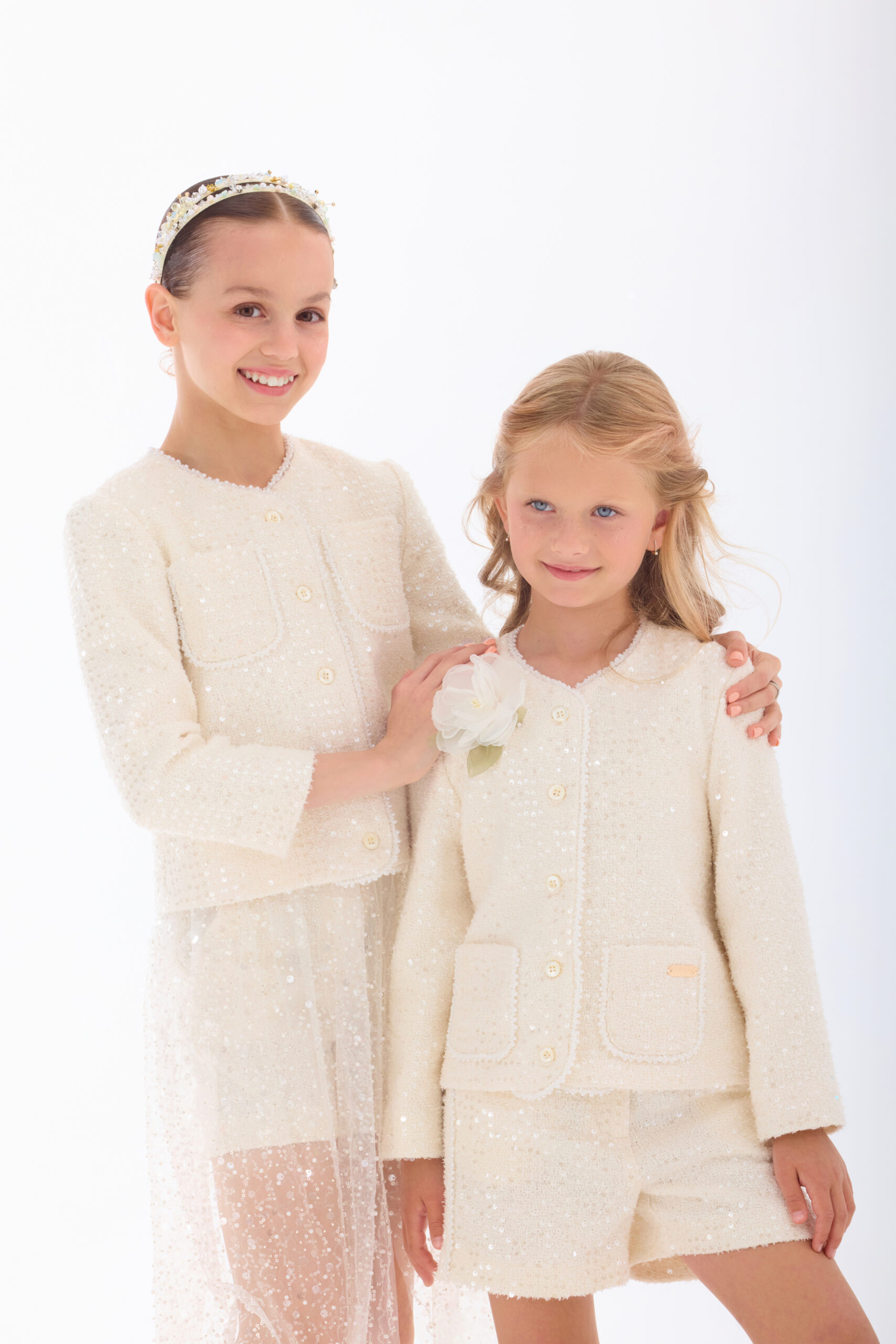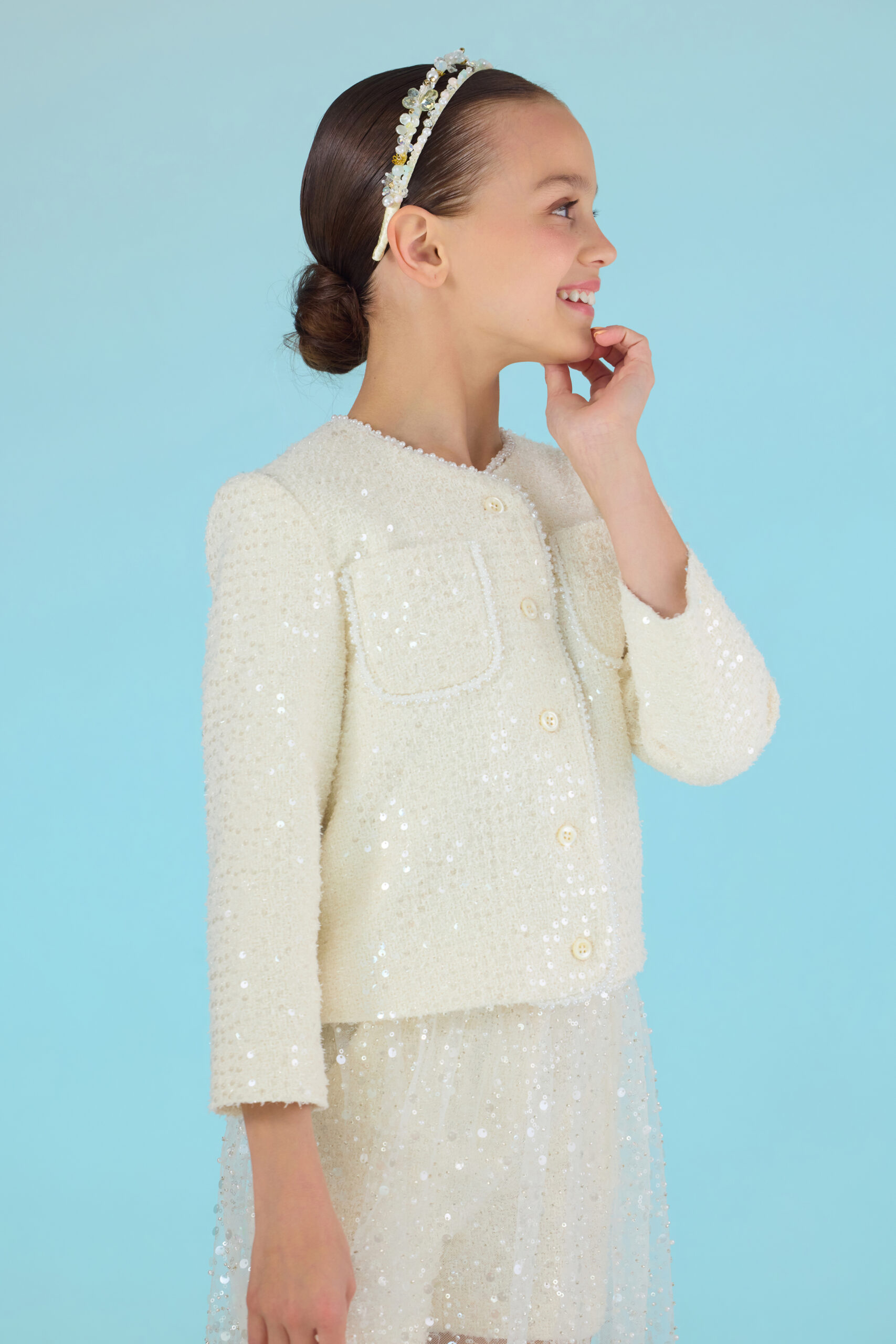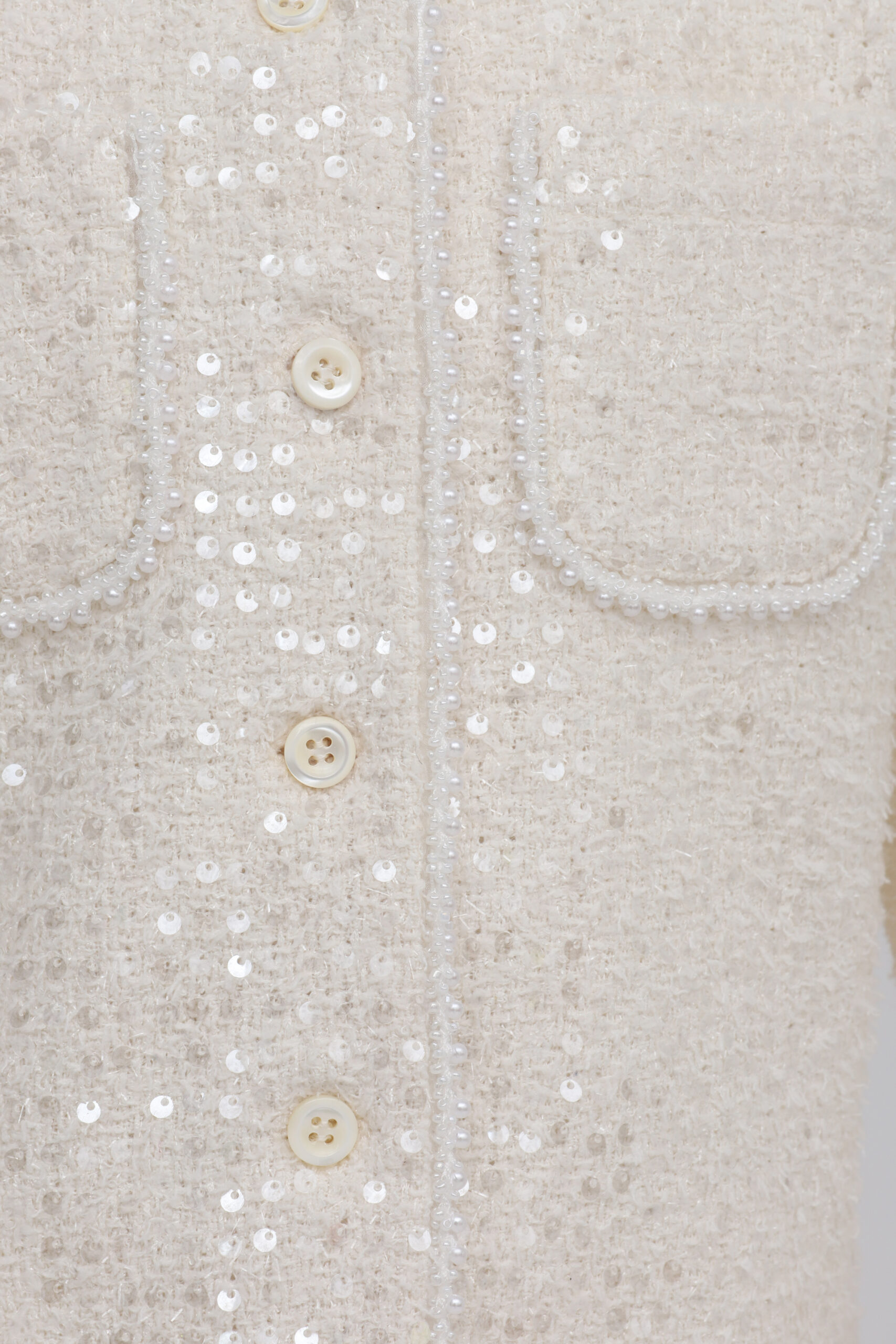 Timeless tailoring meets delicate sparkle in the Cherie Sequin Jacket – Buttoned Edition. Crafted from soft ivory tweed interwoven with shimmering sequins, this design offers a radiant yet refined charm. Unlike the Bloom Edition, this jacket features elegantly placed chest pockets for a slightly sharper, more tailored appeal. The pearl-inspired buttons along the front complete the look with understated sophistication.