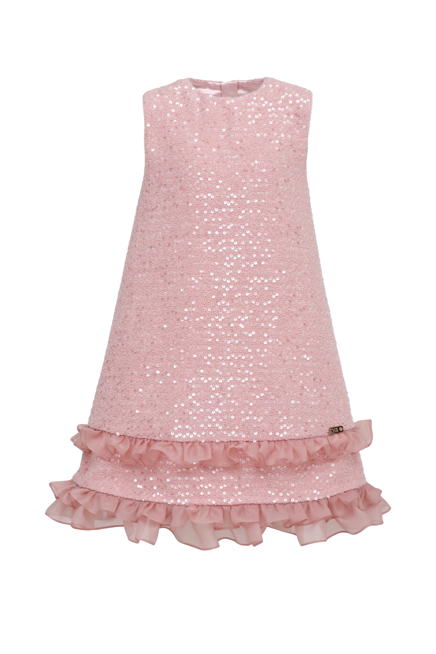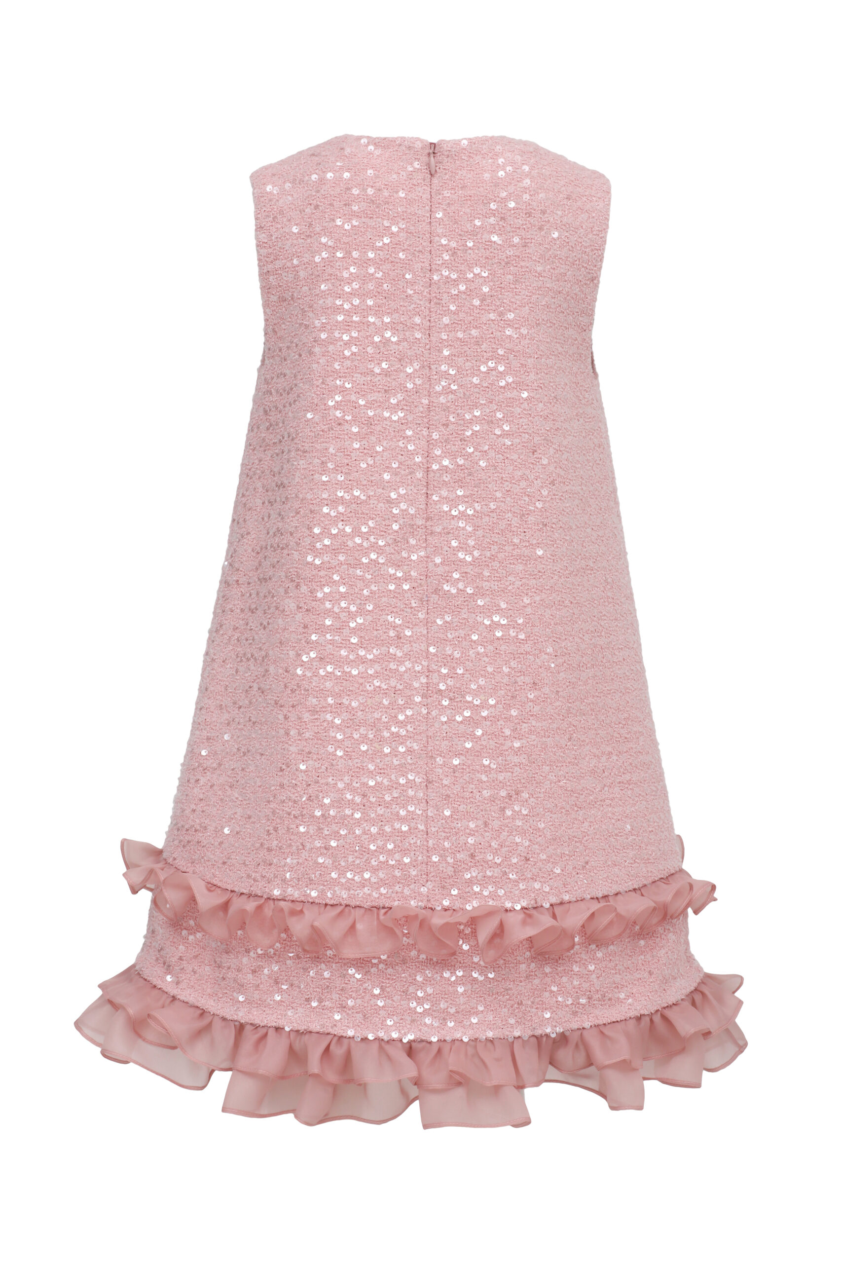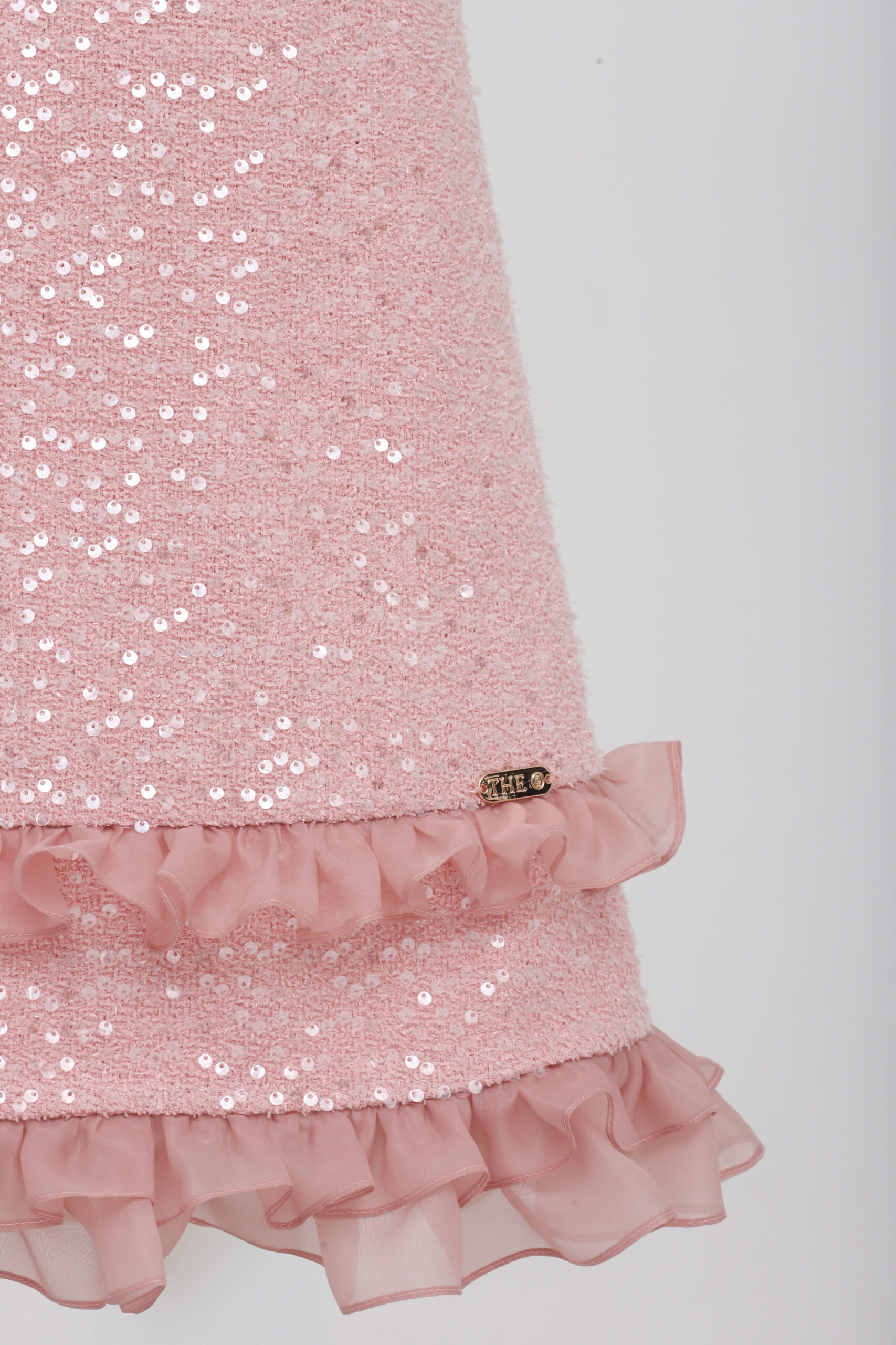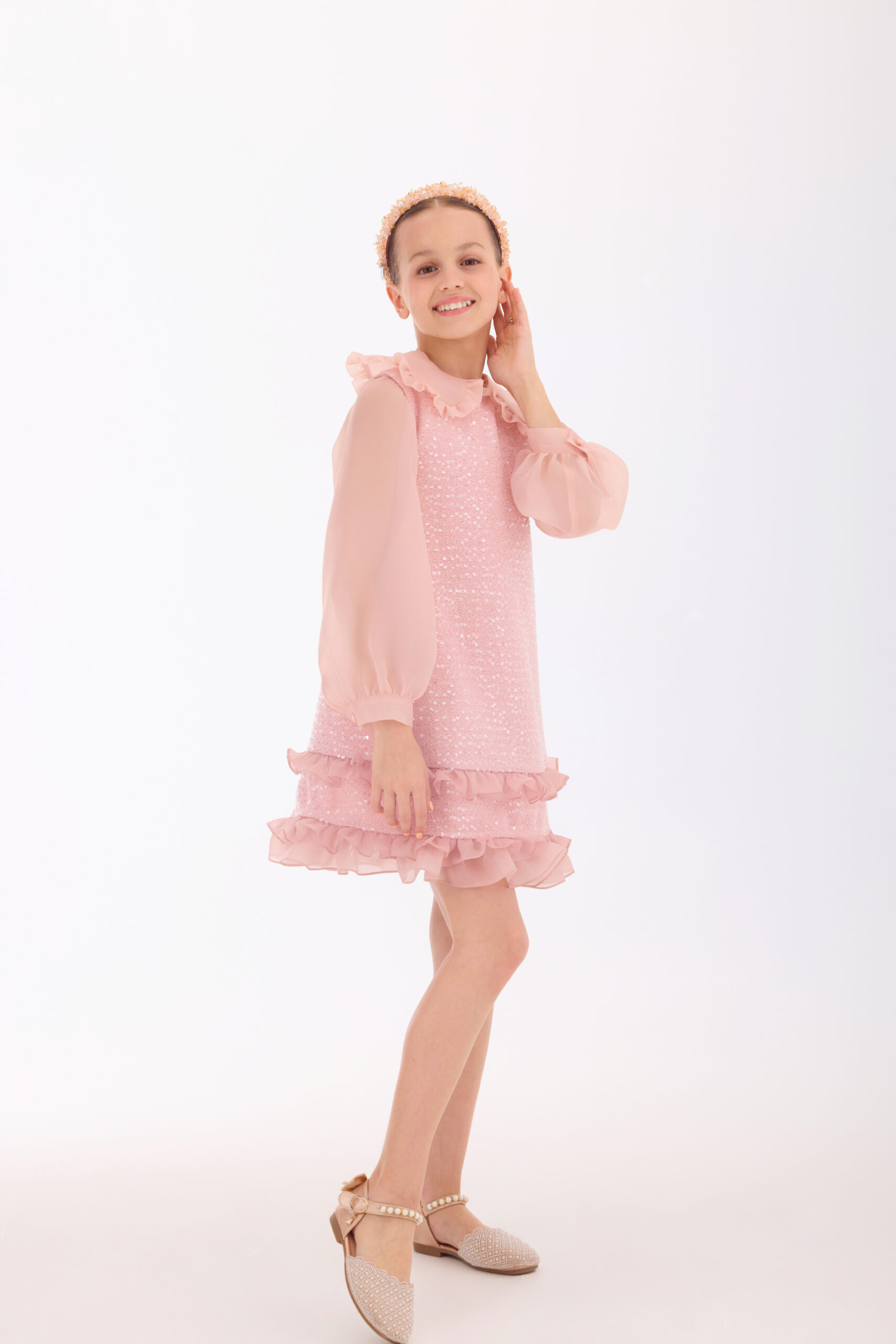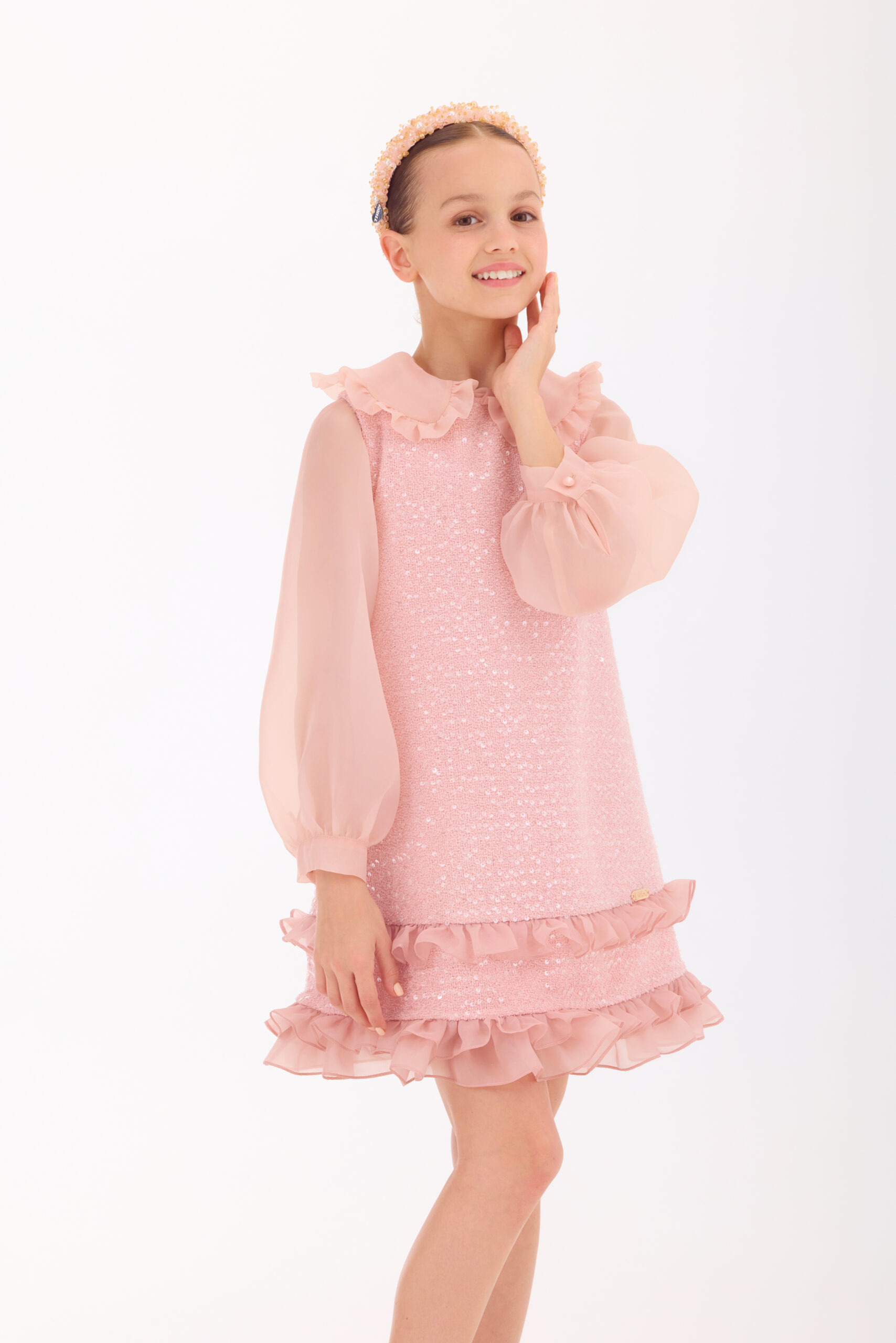 A dance of sparkle and grace, the Violette Sequin Dress in soft pink is designed to enchant at every occasion. Shimmering sequins are delicately layered over a pastel organza base, creating a radiant glow that moves beautifully with each step. The playful ruffle trims along the hem add a touch of whimsy, while the charming organza collar gives the dress a refined elegance.