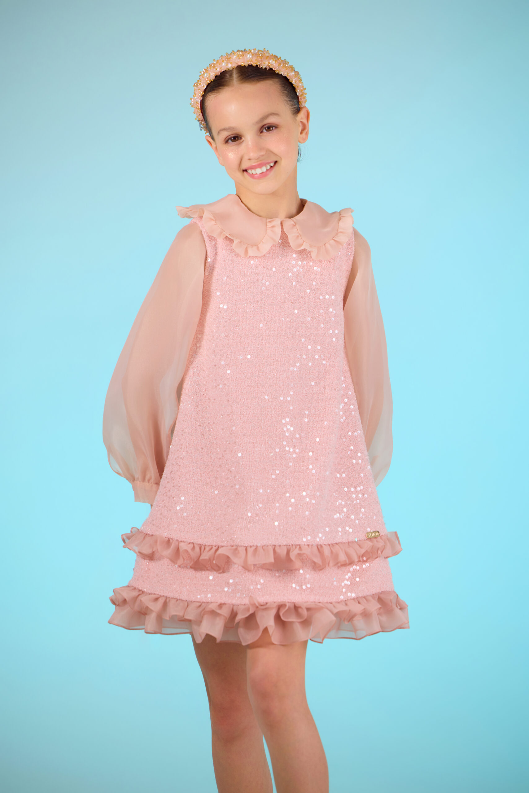 Style Note: The Violette Sequin Dress , Elise Organza Blouse or Cherie Rose Sequin Jacket are designed to complement each other perfectly. When combined, they create a complete look of shimmering elegance and refined charm, ideal for special celebrations or for school days.
